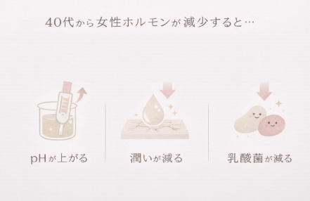 • pHが上がり、バリアが崩れる(中性に近づき、雑菌のパラダイスに)