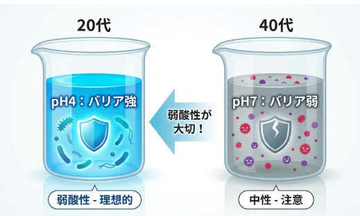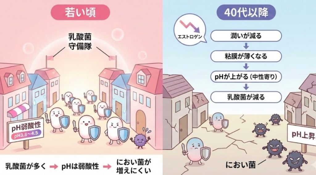 20代や30代の頃、デリケートゾーンは強い酸性(pH3.5〜4.5)に保たれていました。